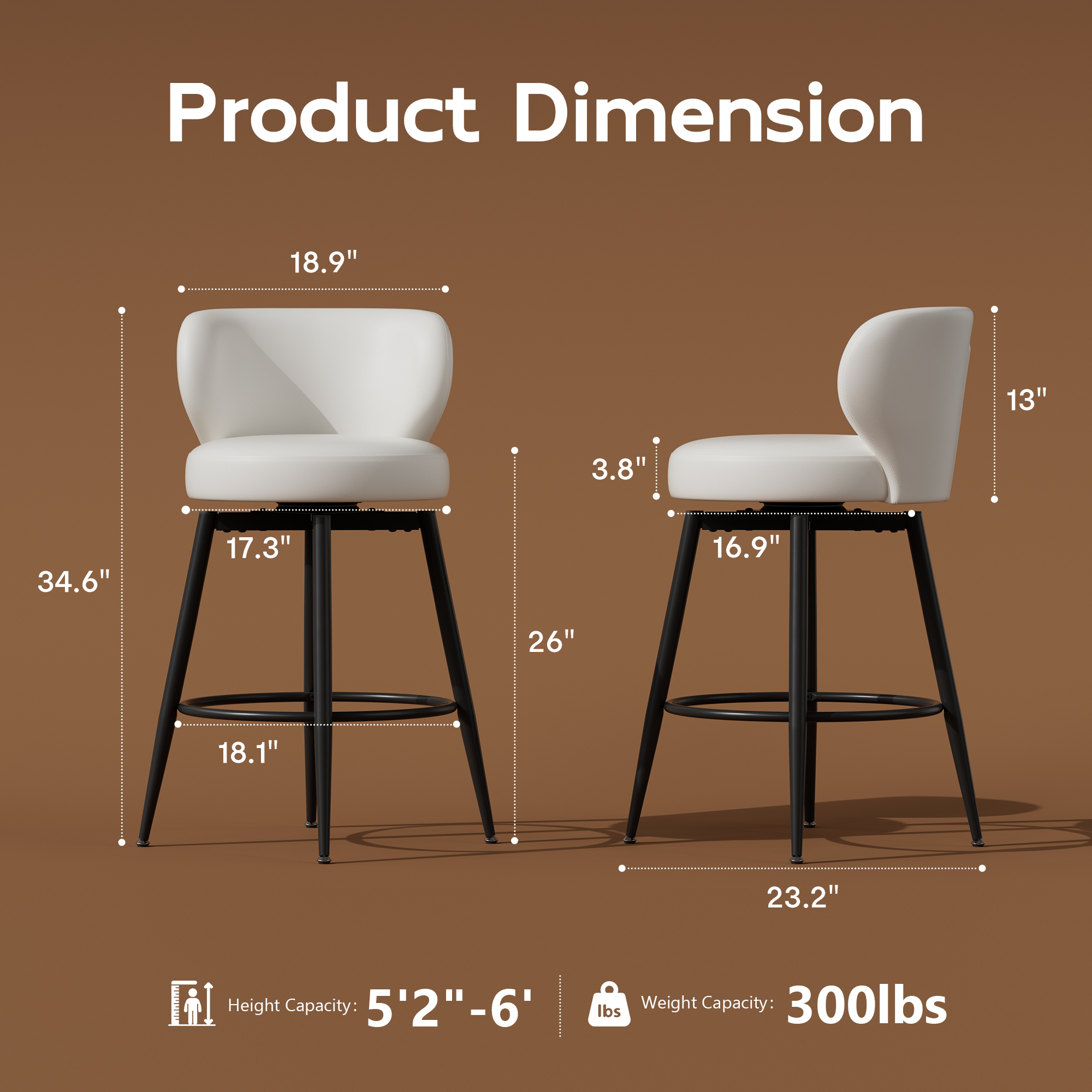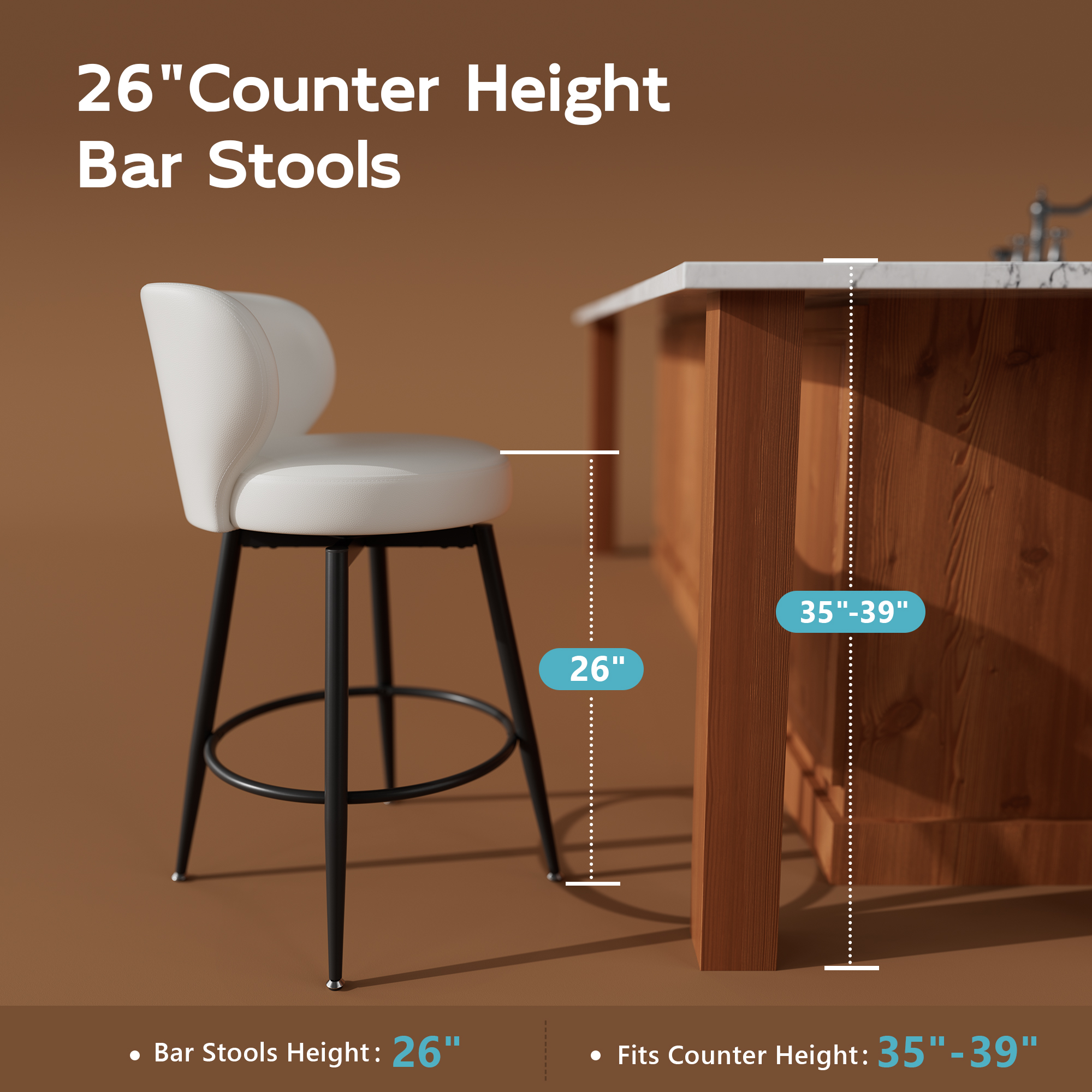 360° Swivel Counter Height Bar Stools, perfect for kitchen islands/home bars, with smooth full rotation for easy movement and conversation. Upholstered in waterproof, durable, easy-clean high-quality PU leather, the padded round seat ensures comfort. Ergonomic low curved back supports the waist for lasting ease. Reinforced metal frame + 360° footrest ring deliver great stability, 300 lbs weight capacity per stool.