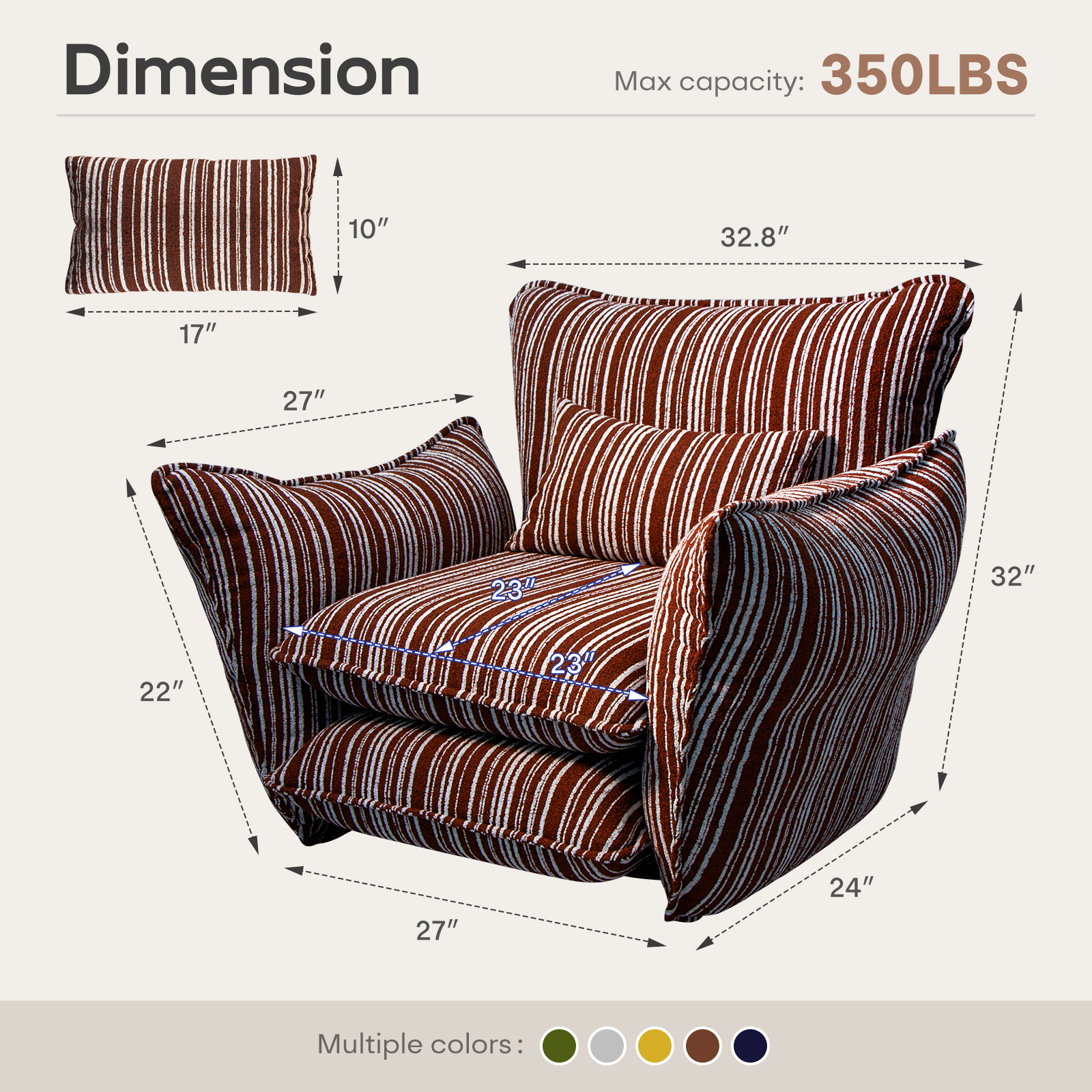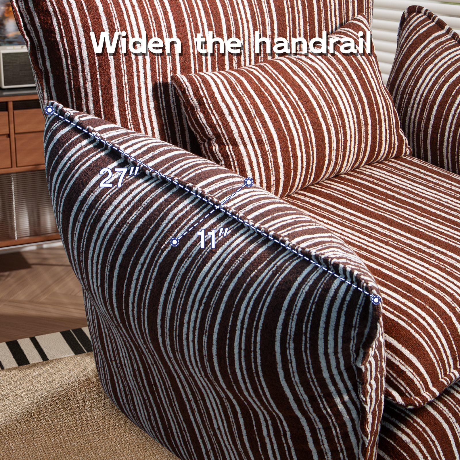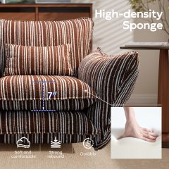 This accent chair features double-layer 7-inch high-density foam for cloud-like comfort, great rebound and durability, ideal for living room & bedroom. Covered in soft, breathable striped chenille fabric, skin-friendly and stylish for modern decor. Ergonomic oversized design with 23″ deep seat & 11″ wide flared armrests offers ample relaxing space.