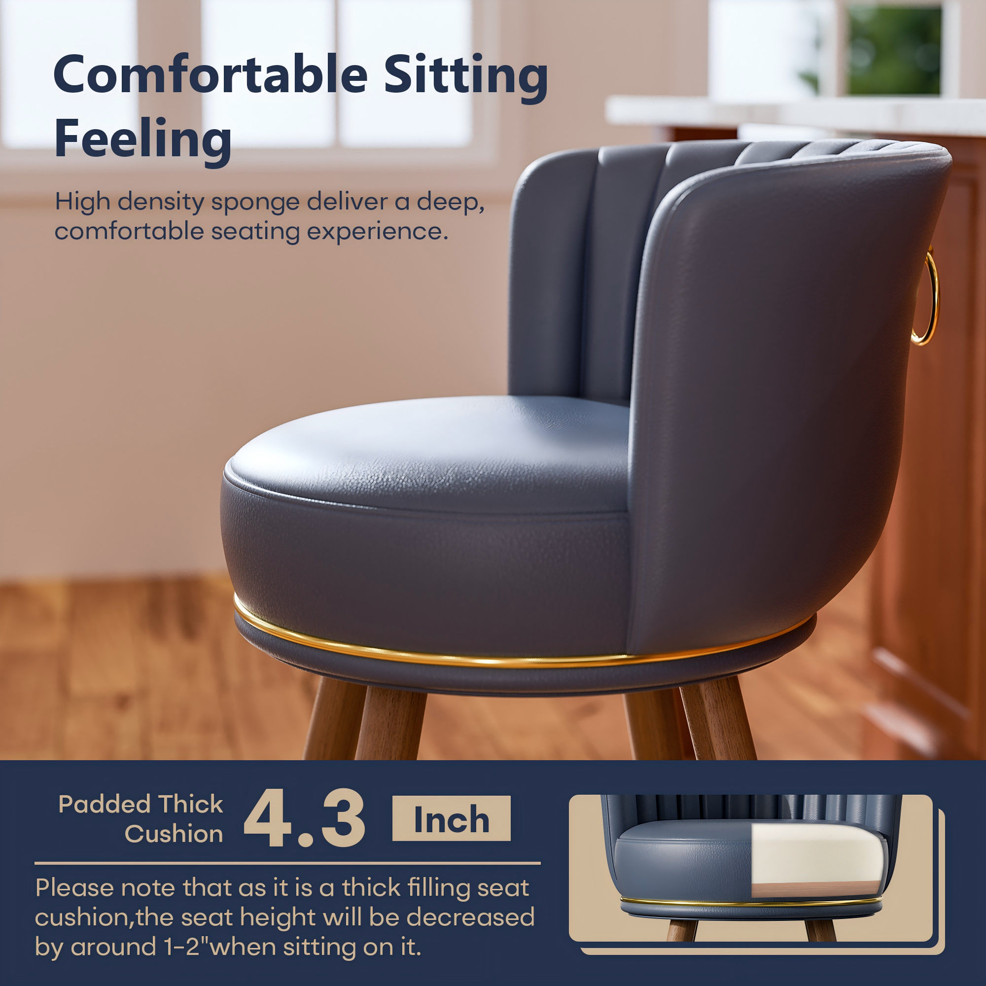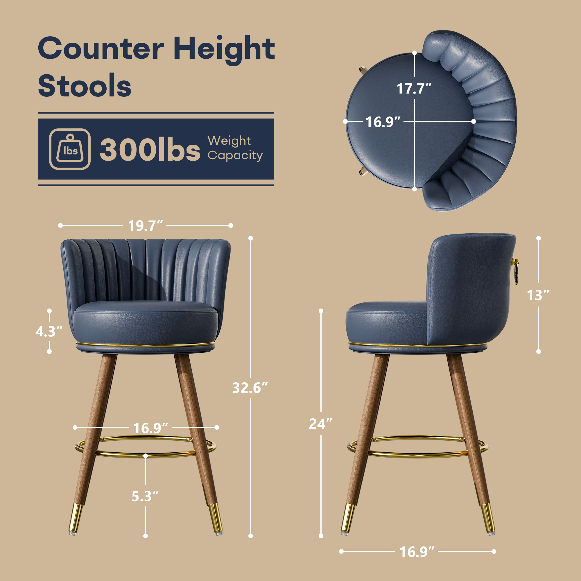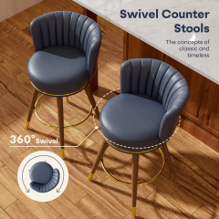 ooHug 24” counter height bar stools (set of 2) feature 360° swivel seats, soft PU leather upholstery, and high-density foam cushions for comfort. Solid rubber wood legs ensure stability, with floor-protecting caps. Size: 17”D x 17.72”W x 33.5”H, supports up to 300 lbs.
