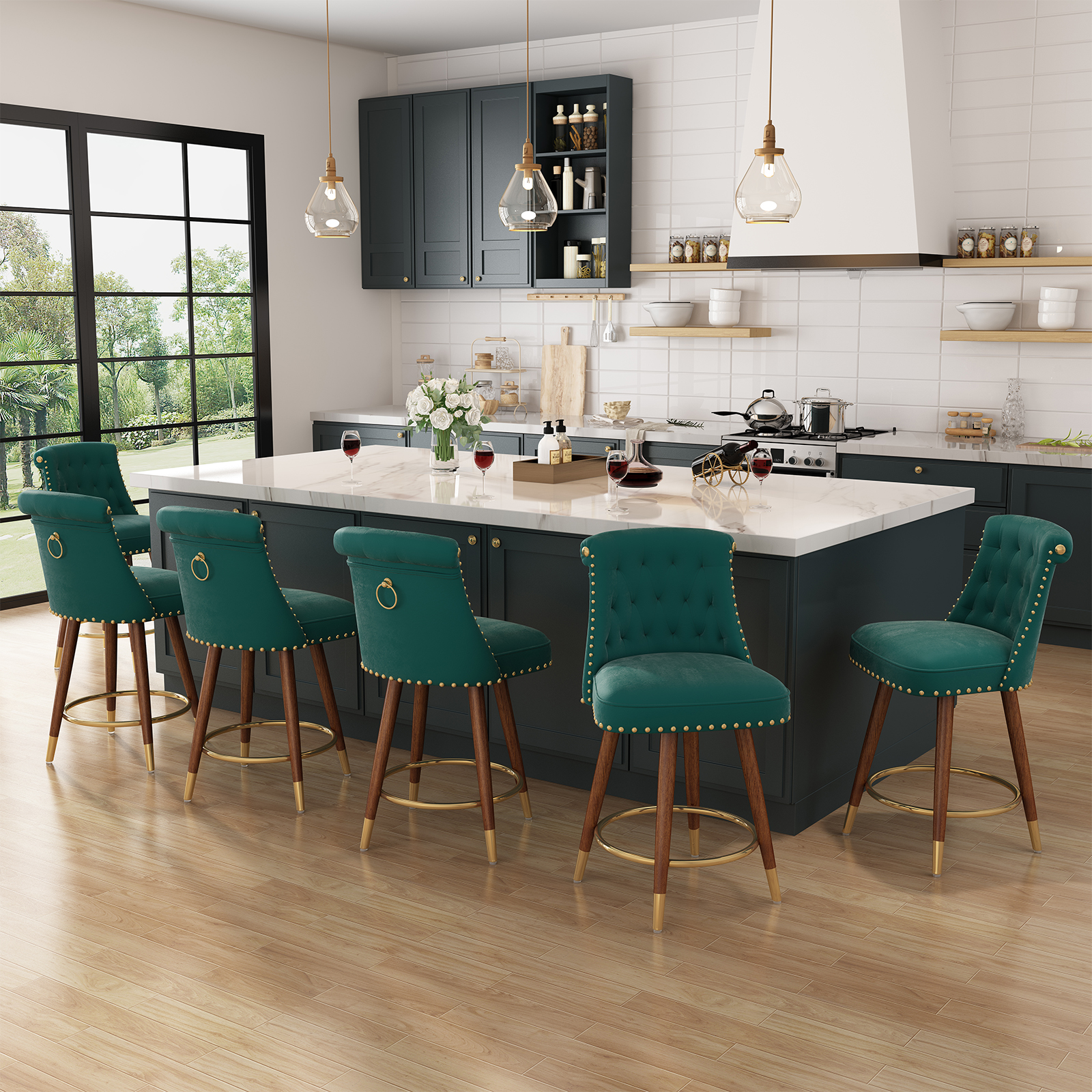 24-inch velvet swivel bar stools for 34″-38″ counters, featuring 360° swivel and high-density foam cushions. Solid rubber wood frame supports up to 300 lbs, with non-slip floor pads. Modern elegant design, simple assembly, perfect for kitchen, dining and home bar spaces.