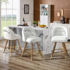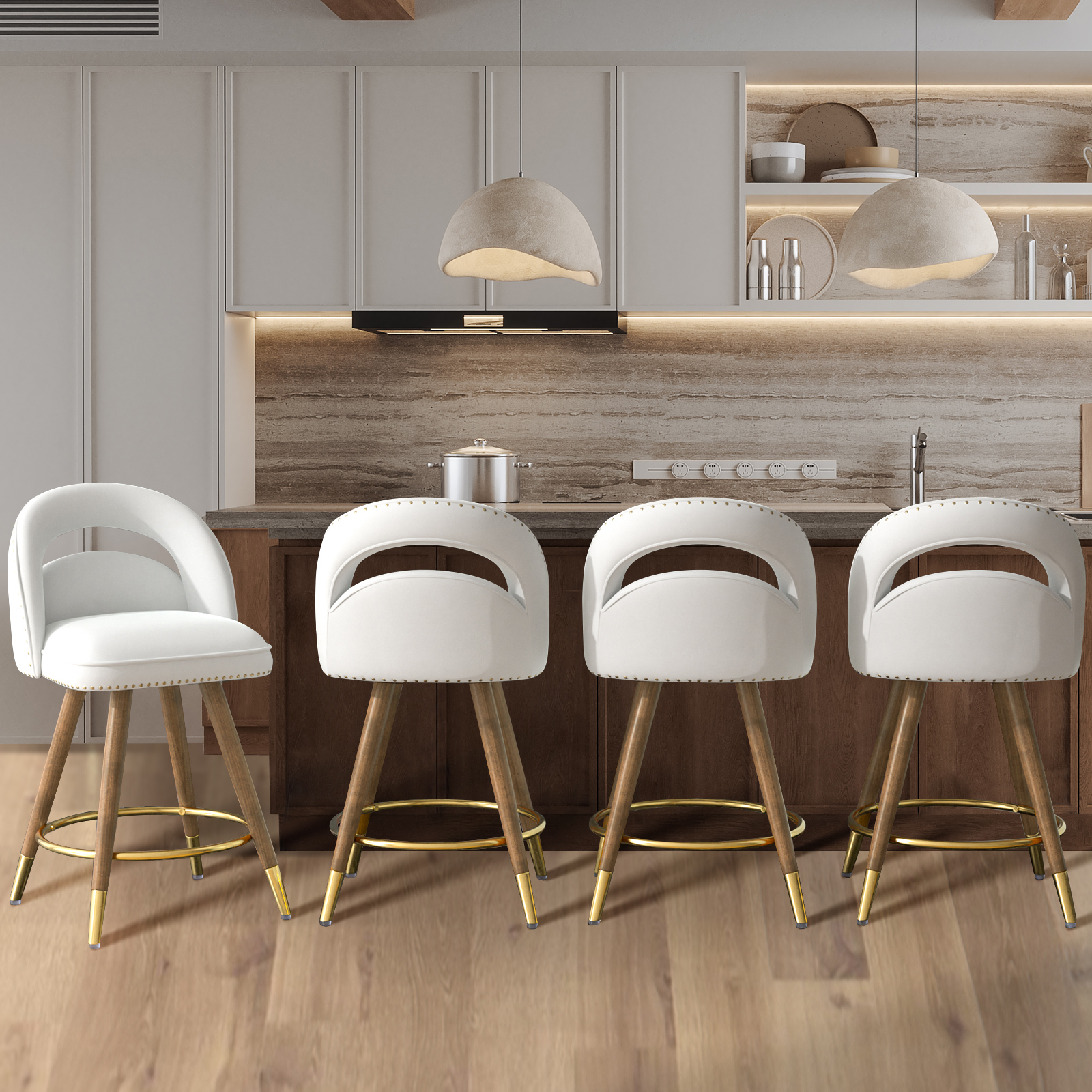 Set of 4 360° swivel bar stools with ergonomic backrest. Solid wood frame supports 300 lbs, with footrest and anti-slip pads. Soft velvet cushions ensure comfort. 24” seat height fits most counters, easy assembly, ideal for home and commercial use.