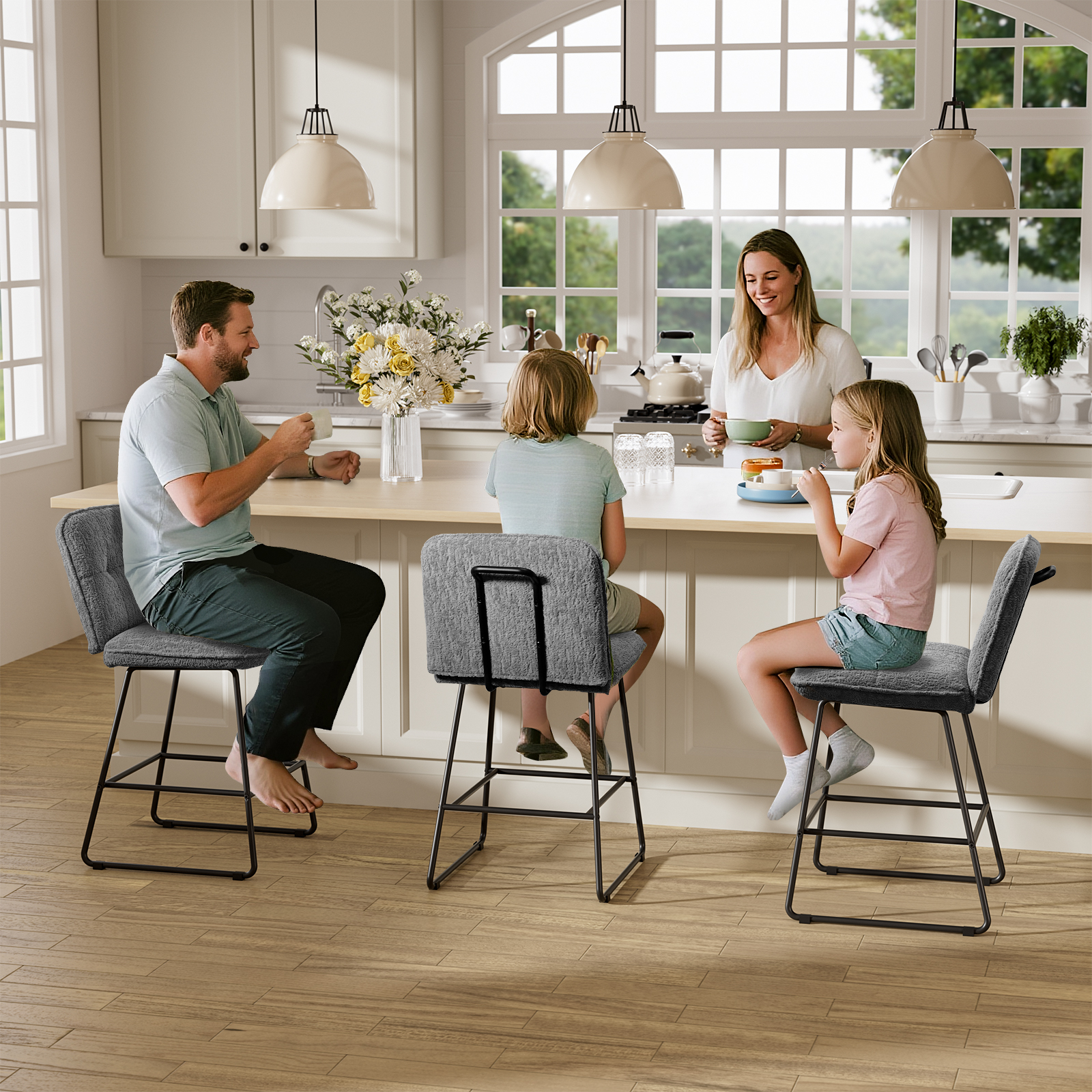 Set of 4 velvet counter height bar stools with ergonomic backrests and high-density cushions. Sturdy metal frame supports 330 lbs, anti-slip pads protect floors. Premium skin-friendly velvet offers plush comfort. Modern versatile design, easy assembly, ideal for kitchen, cafe and home bar.