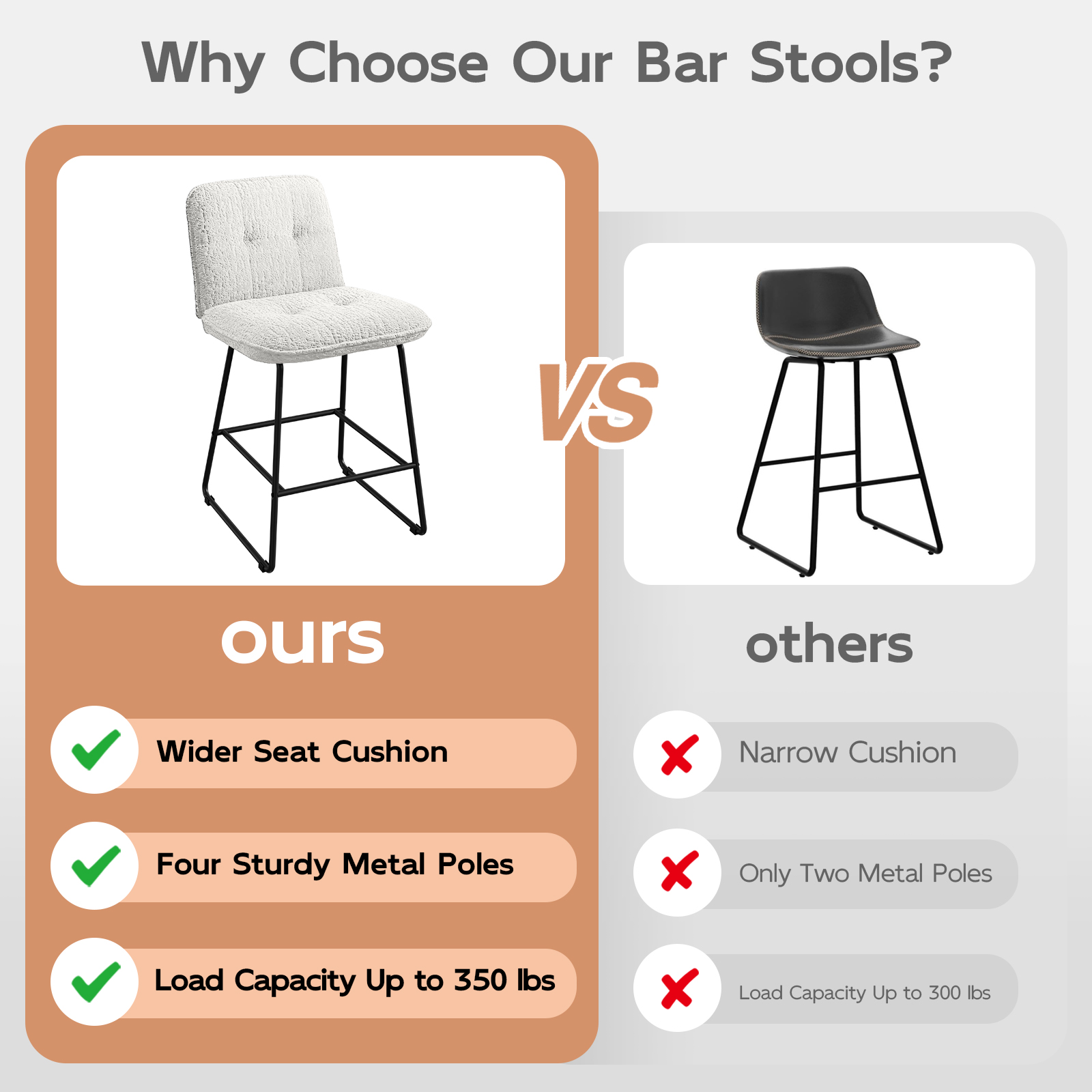 Ergonomic bar stools with contoured backrest, cushioned seat and footrest. Sturdy metal frame supports 330 lbs, anti-slip pads protect floors. Soft velvet upholstery offers cozy comfort. Modern set of 2 fits kitchen, dining room and commercial spaces.