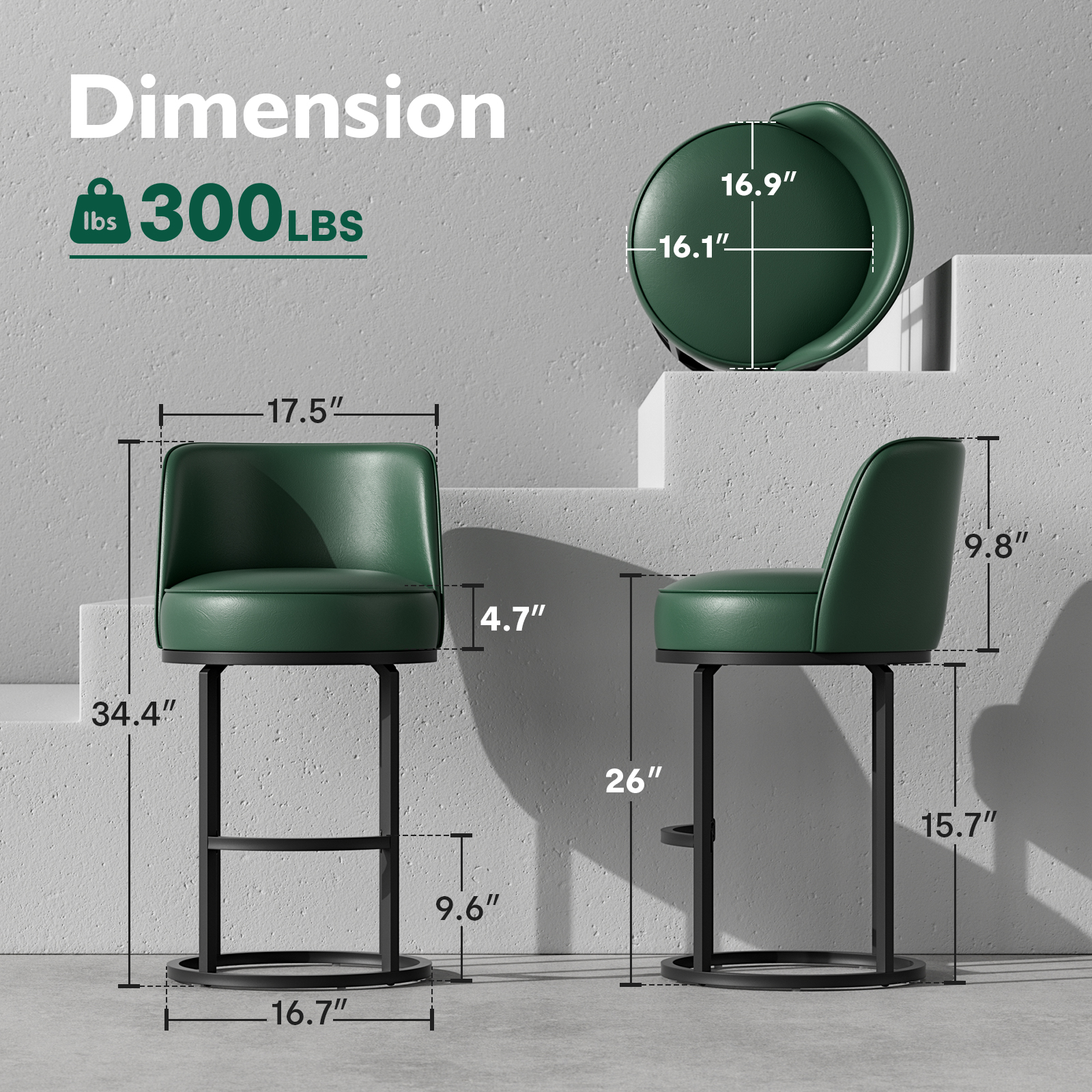 iooHug 26 Inch Swivel Counter Height Bar Stools with Back, Set of 6 PU Leather Bar Chairs with Footrest, Kitchen Counter Stools with Metal Frame, Green