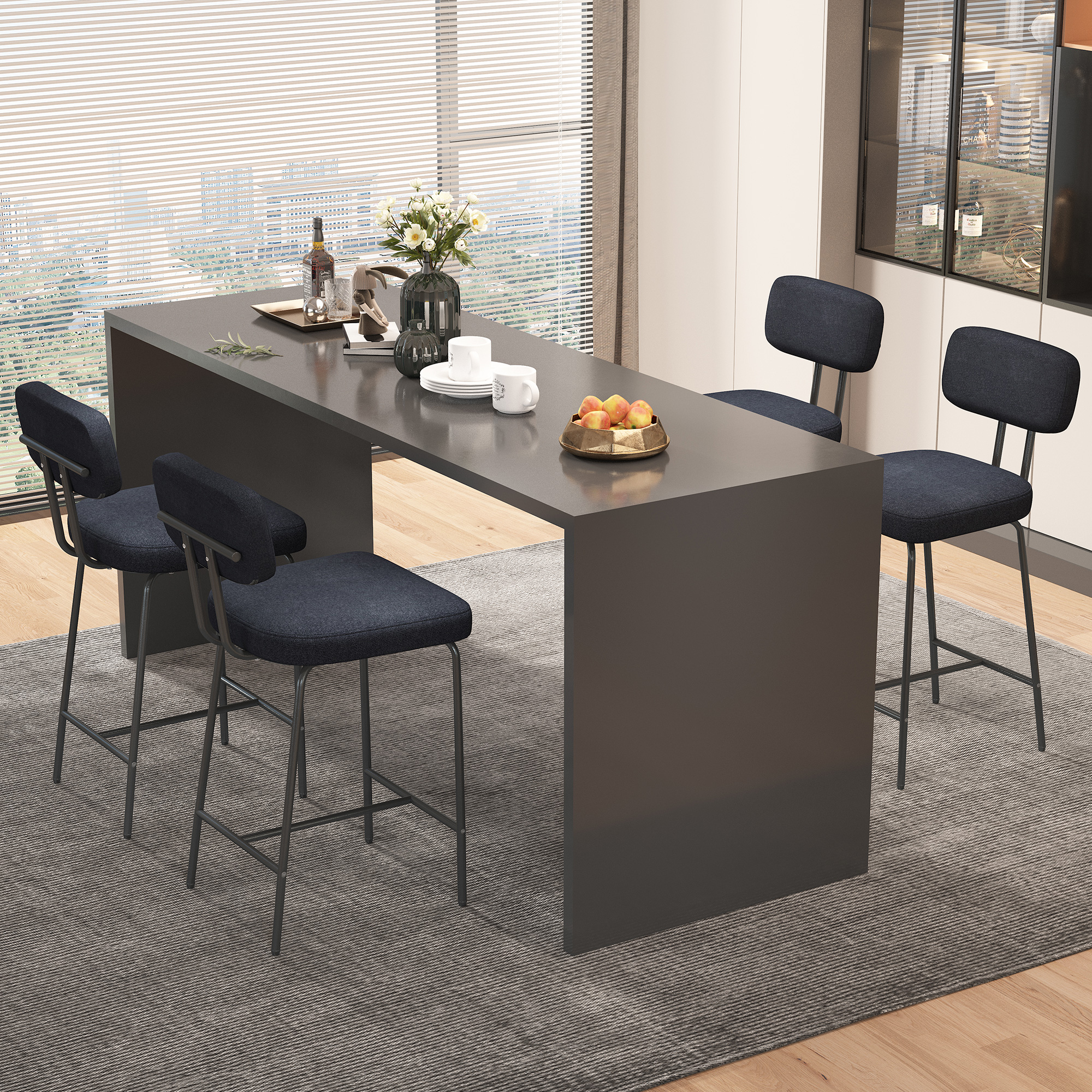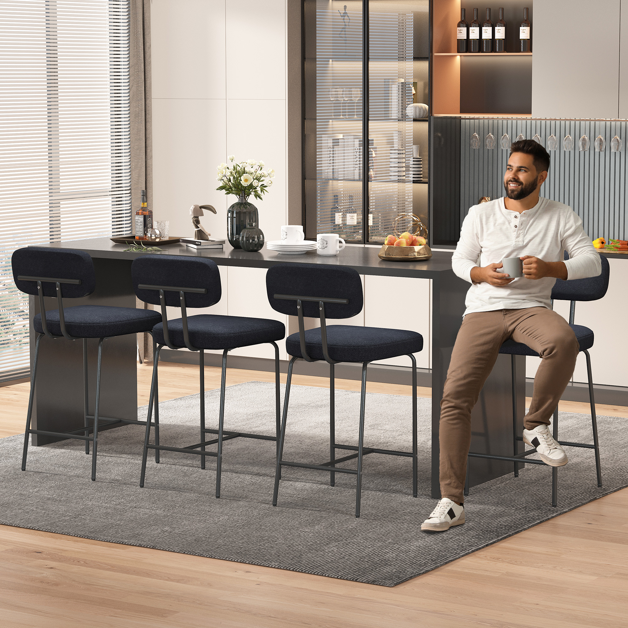 iooHug 26″” Fabric Bar Stools with Backs, Set of 4 Counter Height Bar Stools, Wide Seat Kitchen Island Chairs with Metal Legs for Kitchen Island/Dining Room/Bar, Black