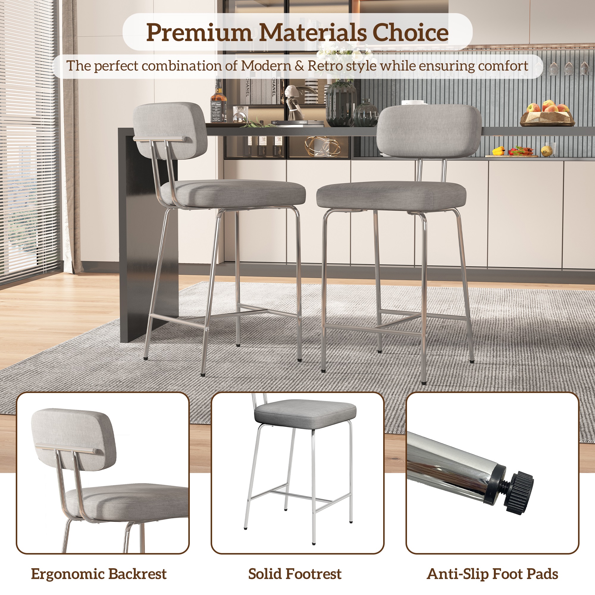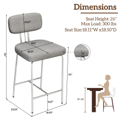 Upholstered 26-inch counter height bar stools feature a sturdy metal frame and dual-material design with premium PU leather and embossed fabric. Ergonomic high back offers comfort and style for kitchen islands, dining areas, home bars and cafes. The stylish texture ensures cozy daily use, with proper size and easy assembly included.