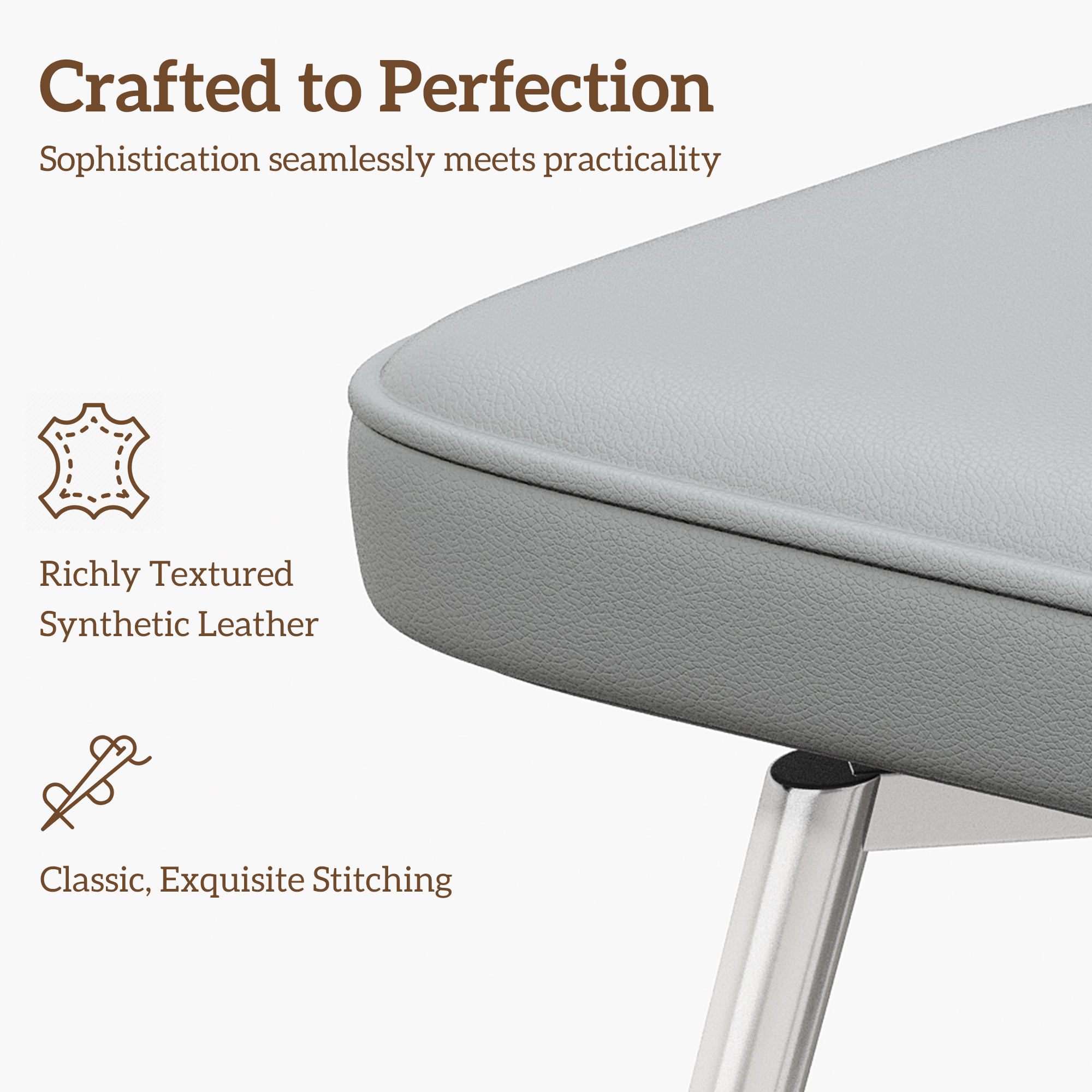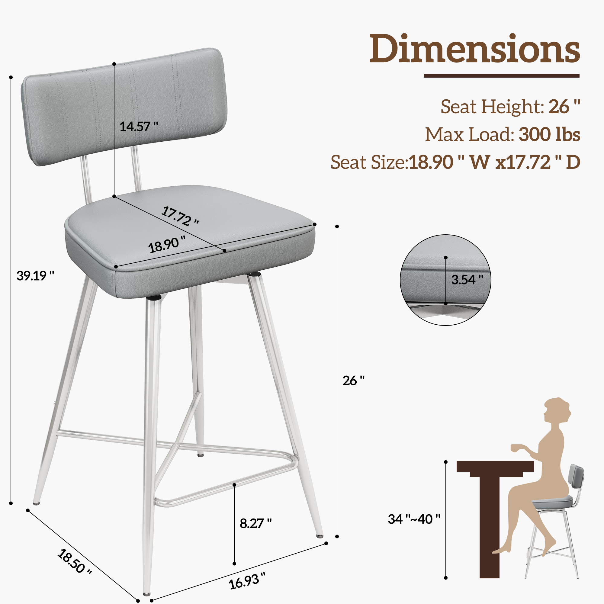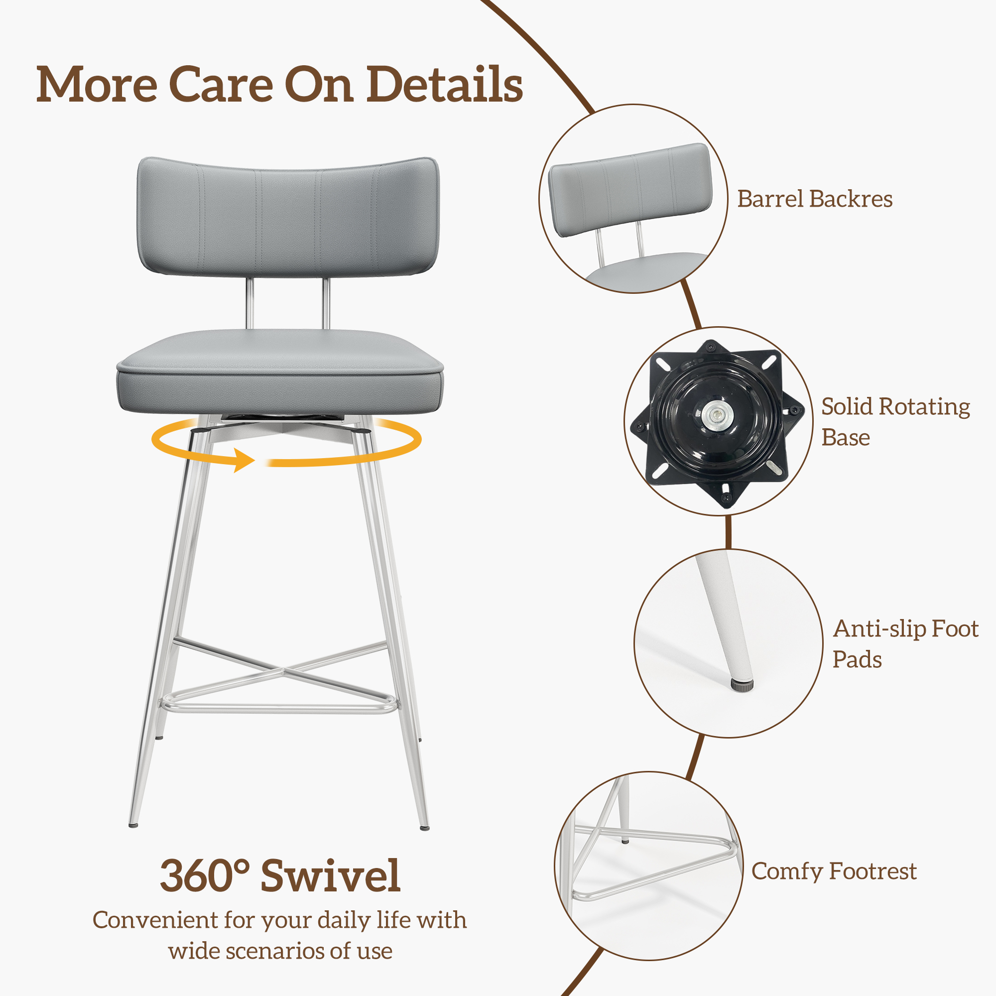 Set of 2 gray 26″ swivel bar stools with wide cushioned seats and supportive backrest. 360° smooth rotation, sturdy metal base supports 300 lbs. Footrests and adjustable feet ensure stability. Premium leather, easy assembly, perfect for kitchen, home bar and cafes.