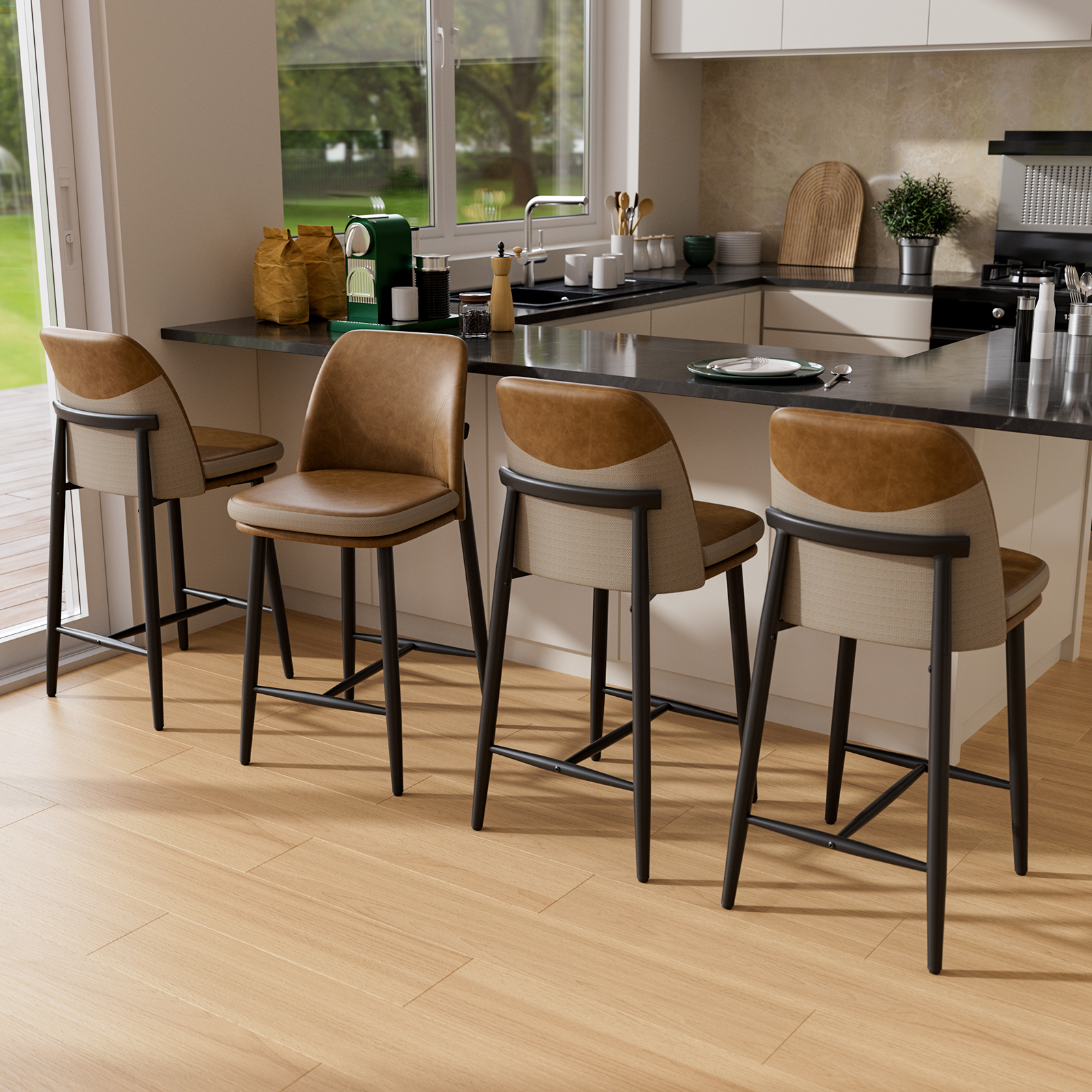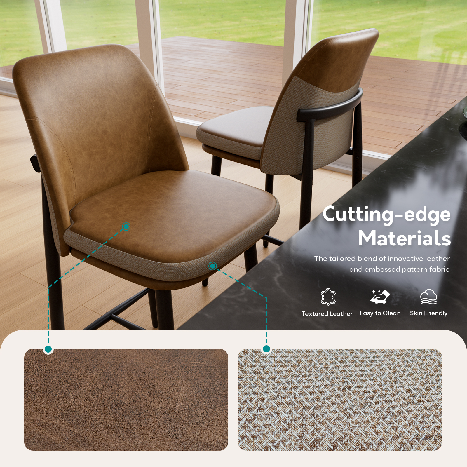 Upholstered 26″ counter height bar stools with sturdy metal frame, premium PU leather & embossed fabric dual-material design for sophisticated style. Ergonomic high back ensures comfort, ideal for kitchen islands, dining areas, home bars and cafés. The stylish textured blend offers luxury and coziness. Well-proportioned, streamlined structure with easy assembly.