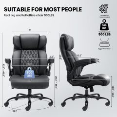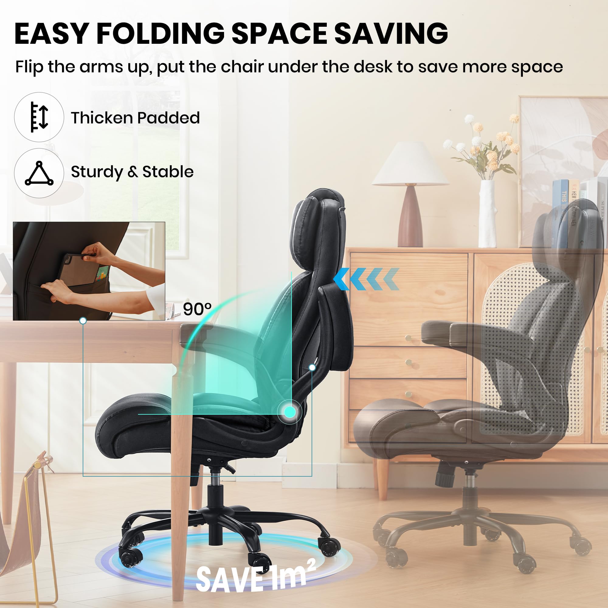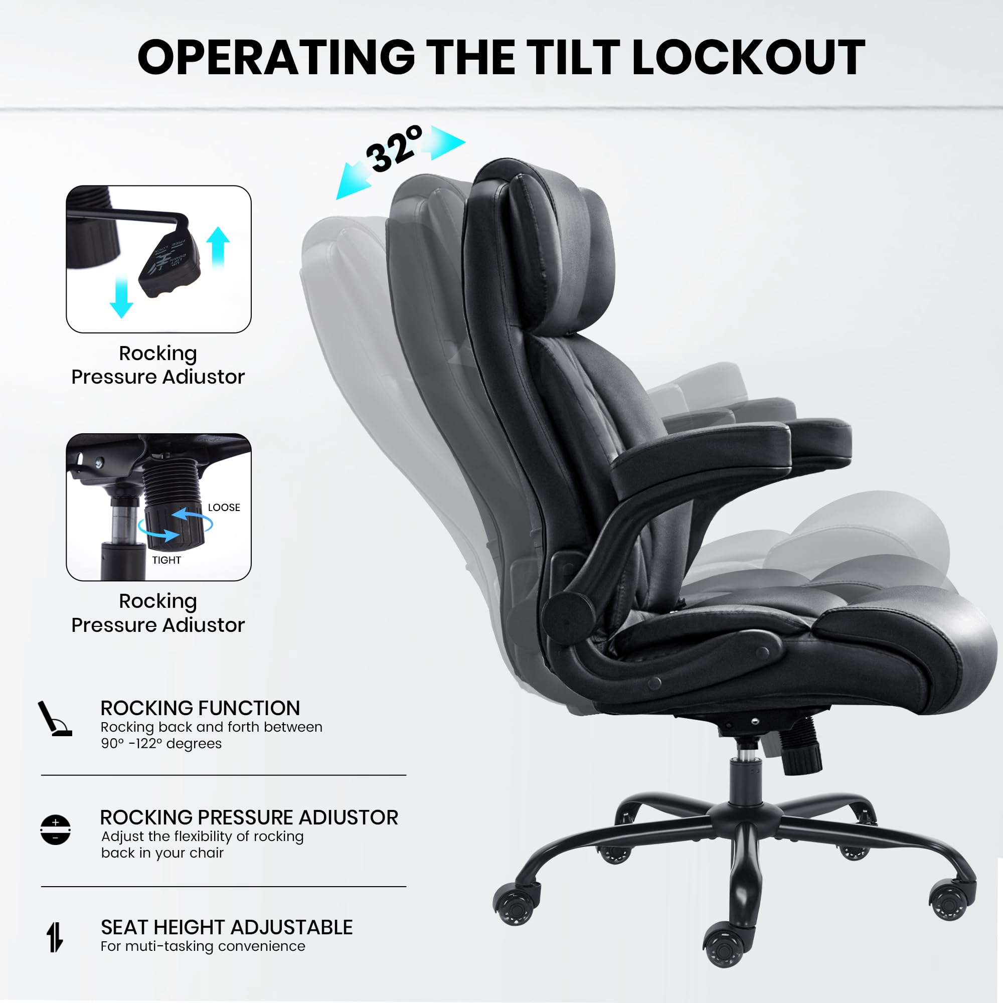 iooHug Big and Tall Office Chair 500lbs, Ergonomic Executive PU Leather Desk Chair with Adjustable Lumbar Support, Heavy Duty Computer Chair with Flip-up Arms Wheels, Black