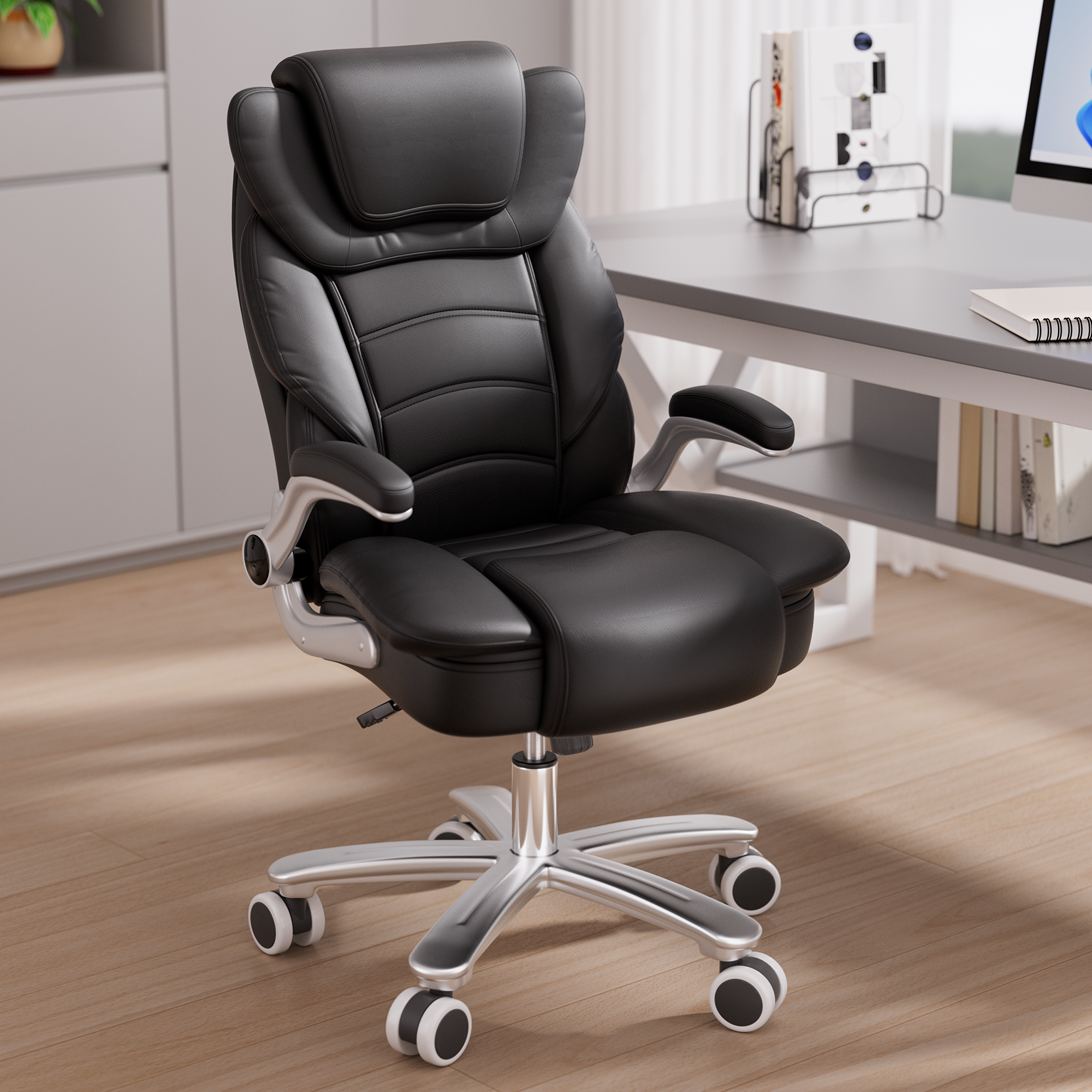 iooHug Big & Tall Faux Leather Executive Office Chair features durable, easy-clean faux leather upholstery with high-density sponge padding for a premium finish. Segmented cushioning, adjustable lumbar support and a high backrest deliver all-day ergonomic comfort for home/work. Flip-up padded armrests save space and enable flexible sitting. Reinforced metal frame + 360° swivel casters ensure stability, supporting up to 400 lbs durably.
