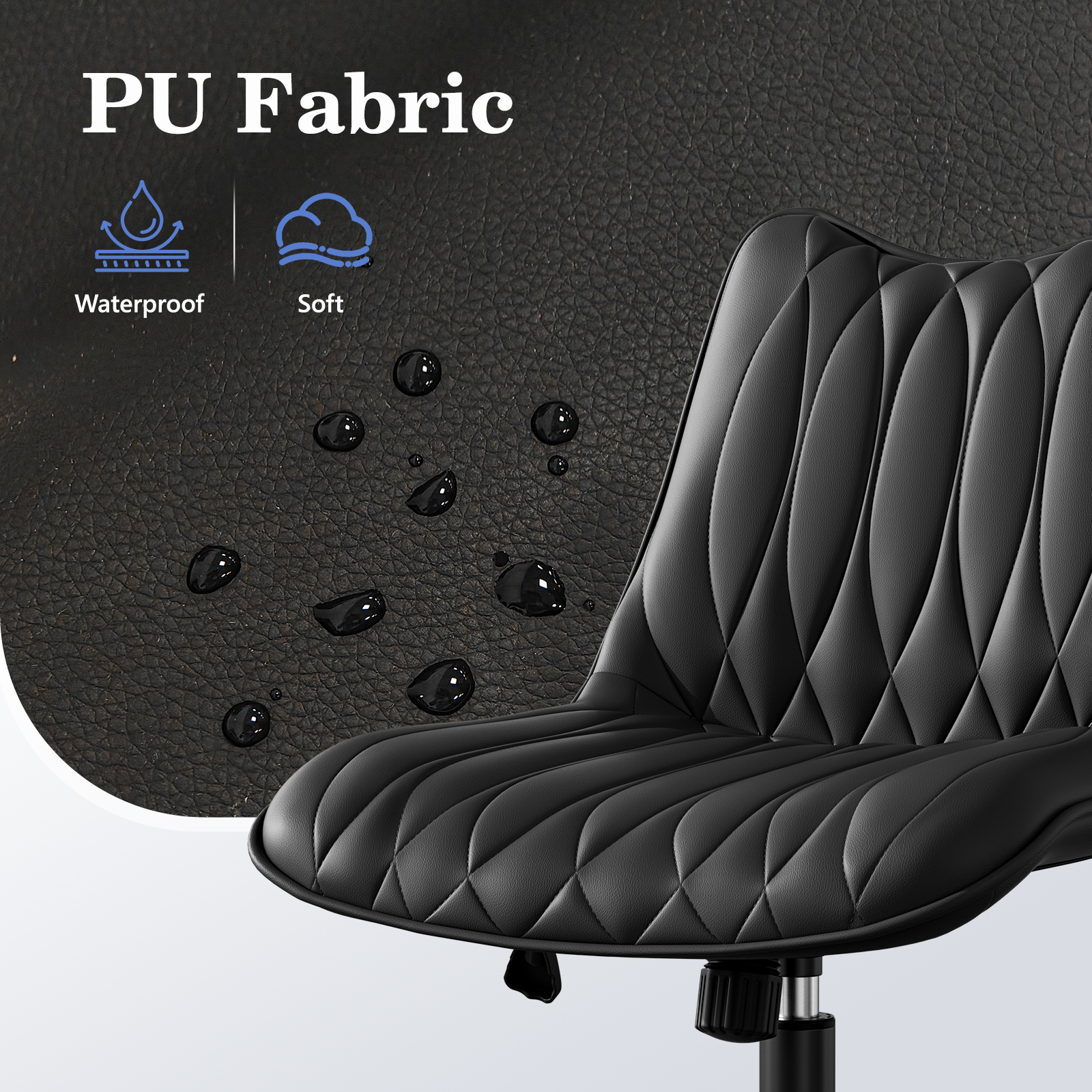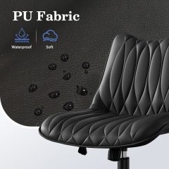 Sleek modern armless home office chair with minimalist silhouette and elegant diamond-stitched faux leather, elevating workspaces/vanities/studies. Contoured backrest and supportive high-density foam padding deliver ergonomic comfort, maintaining shape for long work/study. Adjustable seat height via lever, 360° smooth swivel, and rolling casters gliding on carpets/hardwood for flexible movement.