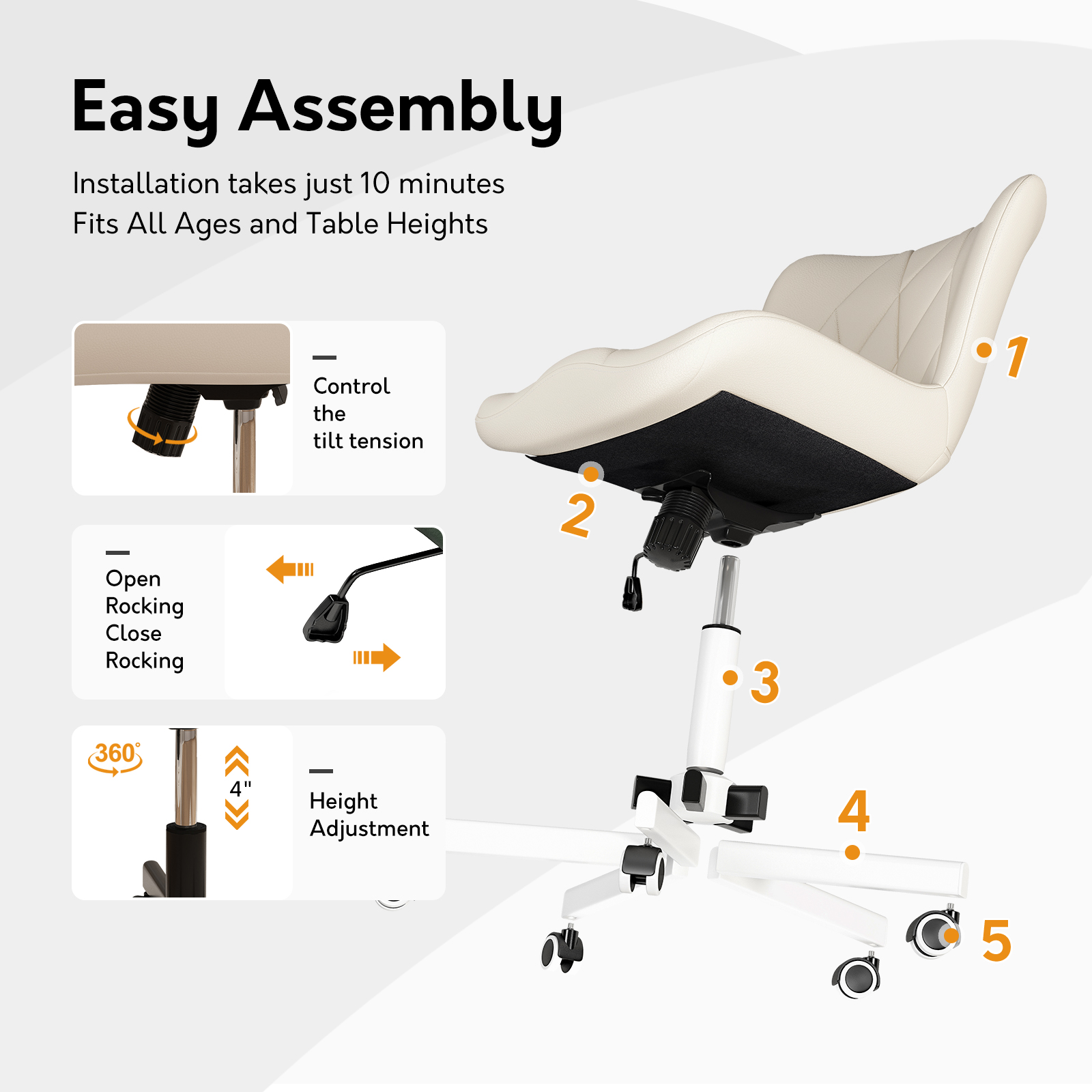 Armless office chair suitable for 5’0″–6’2″ users, with 3.5″ memory foam cushion and durable PU leather. Features adjustable height, tilt, 360° swivel and smooth casters. Sturdy metal base supports 300 lbs, compact space-saving design, ideal for home offices, dorms and vanity use.