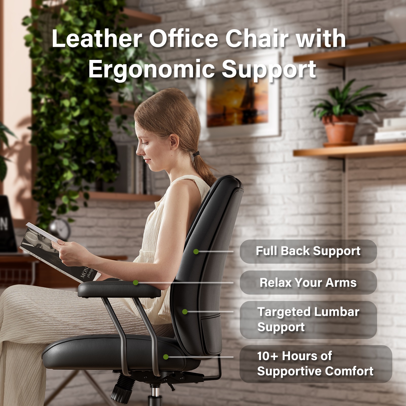 Vintage PU Leather Office Chair with silent rolling wheels, fuses retro aesthetics & modern functionality, ideal as desk/executive/gaming chair for home/office. Built-in lumbar support delivers ergonomic comfort, maintaining healthy posture and relieving back fatigue for long sitting/studying/PC use. 360° swivel, smooth height adjustment & gentle rock, fits 5.0’–6.3′ users, adapting to various desk heights and seating needs.