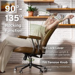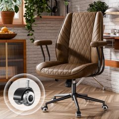 Vintage PU Leather Office Chair with silent rolling wheels, fuses retro aesthetics & modern functionality, ideal as desk/executive/gaming chair for home/office. Built-in lumbar support delivers ergonomic comfort, maintaining healthy posture and relieving back fatigue for long sitting/studying/PC use. 360° swivel, smooth height adjustment & gentle rock, fits 5.0’–6.3′ users, adapting to various desk heights and seating needs.