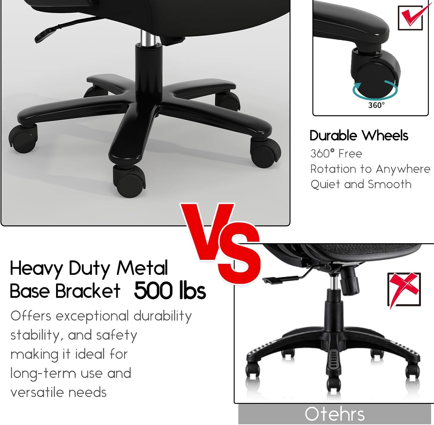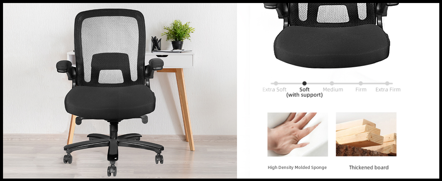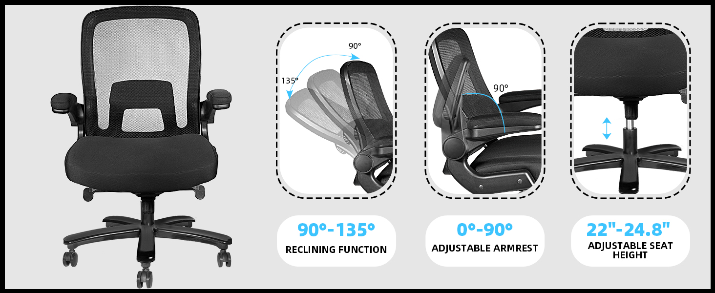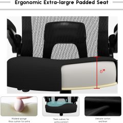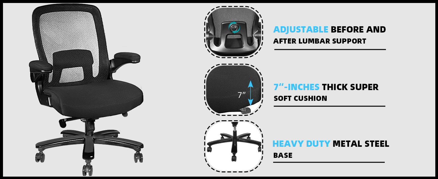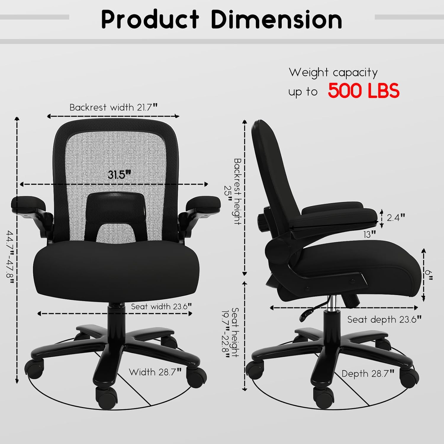 Extra-large office chair supports up to 500 lbs with a wider, thicker cushion for enhanced comfort. Adjustable lumbar support relieves pressure, while a sturdy metal tilt-control base ensures durability. Breathable mesh, high-density foam, and flip-up armrests provide ergonomic comfort. Rocking, swivel, and height adjustment offer versatility. Easy assembly in 15 minutes, with reliable customer support.
