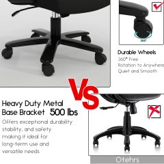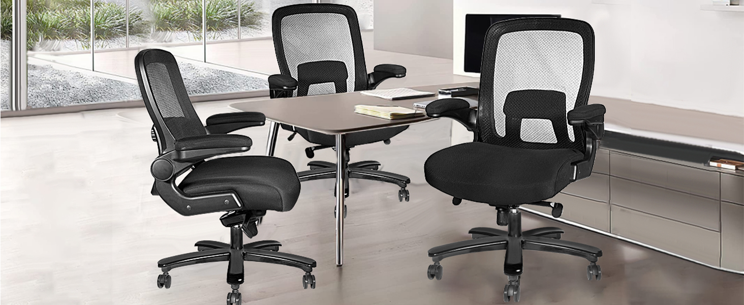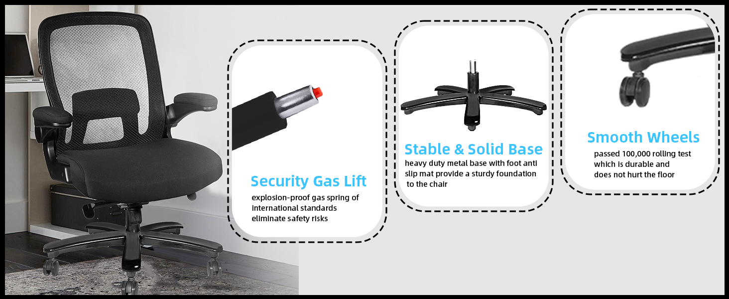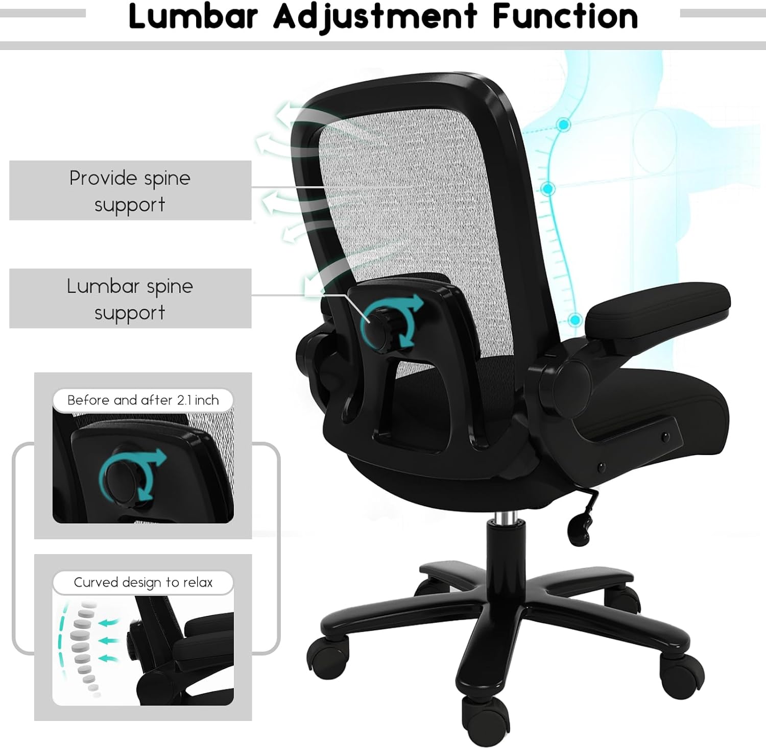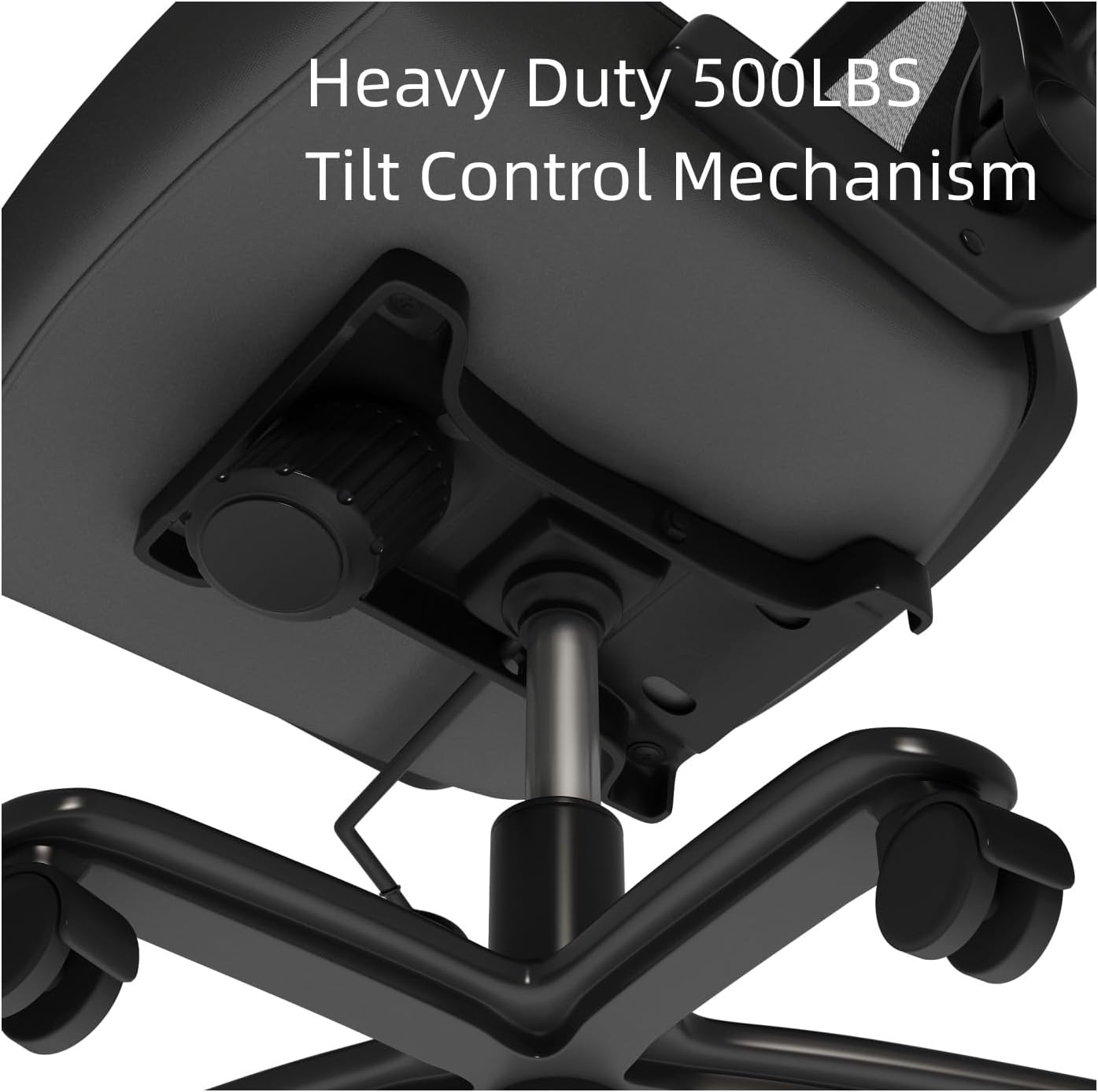 Extra-large office chair supports up to 500 lbs with a wider, thicker cushion for enhanced comfort. Adjustable lumbar support relieves pressure, while a sturdy metal tilt-control base ensures durability. Breathable mesh, high-density foam, and flip-up armrests provide ergonomic comfort. Rocking, swivel, and height adjustment offer versatility. Easy assembly in 15 minutes, with reliable customer support.