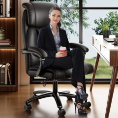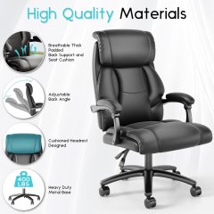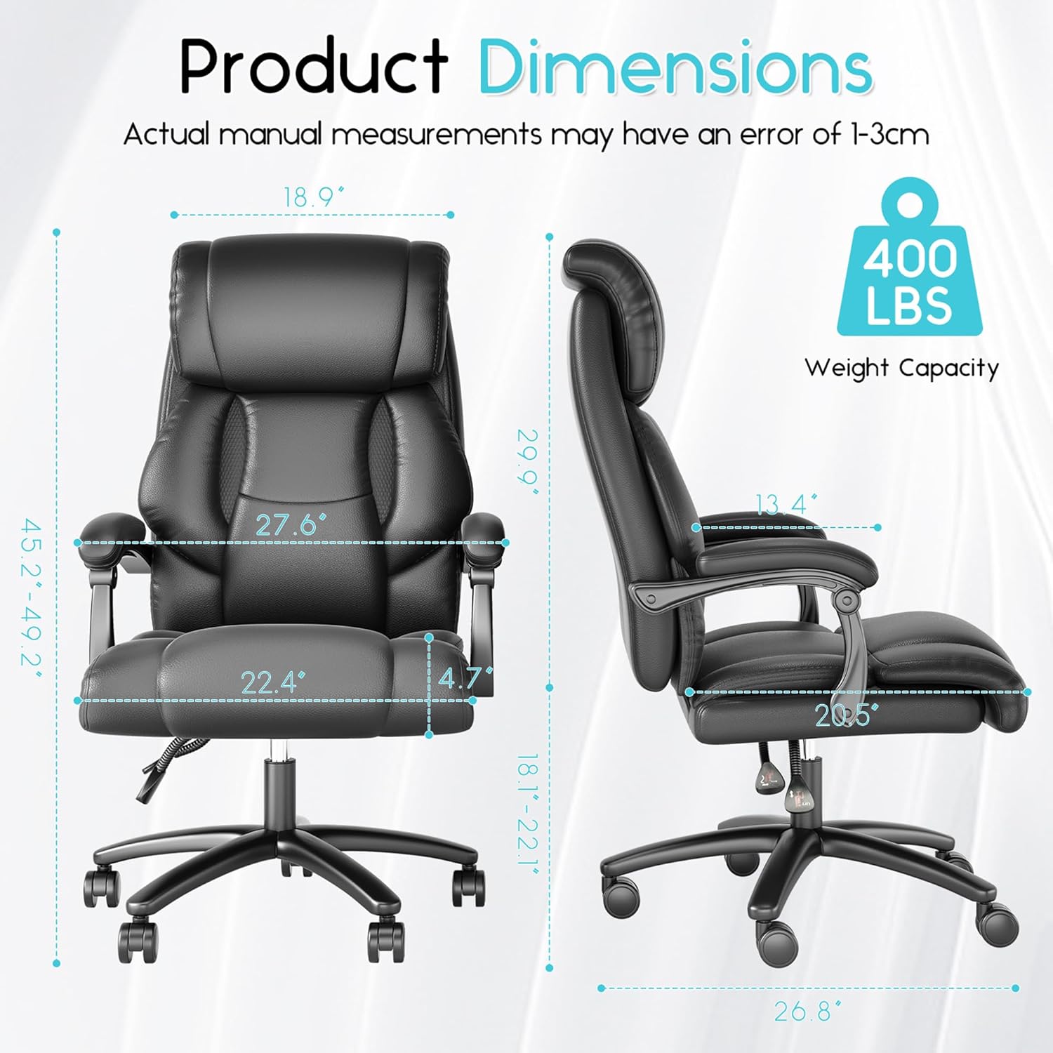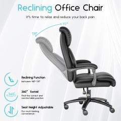 Adjustable high-back office chair reclines 92°-138° with height adjustment and thick armrests for comfort. Supports up to 400 lbs with a sturdy metal base and oversized cushion. Ergonomic design with a wide backrest and headrest ensures lasting support. 360° swivel wheels and a durable frame provide stability.